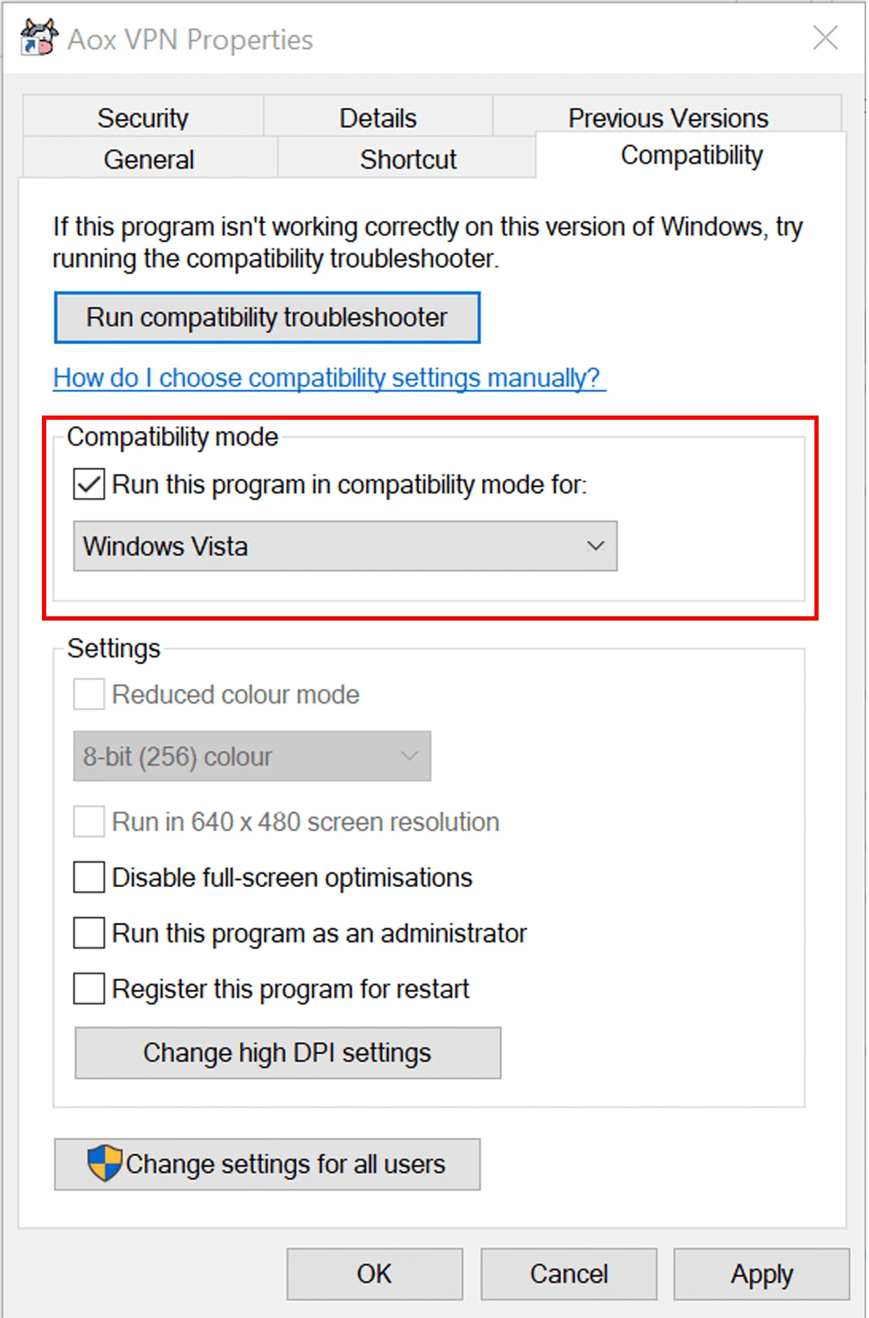 Set Compatibility to Windows Vista: Right click on the desktop AoxVPN shortcut and select "Properties" -> "Compatibility" -> "Select Windows Vista". Restart your computer and reinstall AoxVPN software. Close AoxVPN software and delete all AoxVPN icons, restart AoxVPN software again.